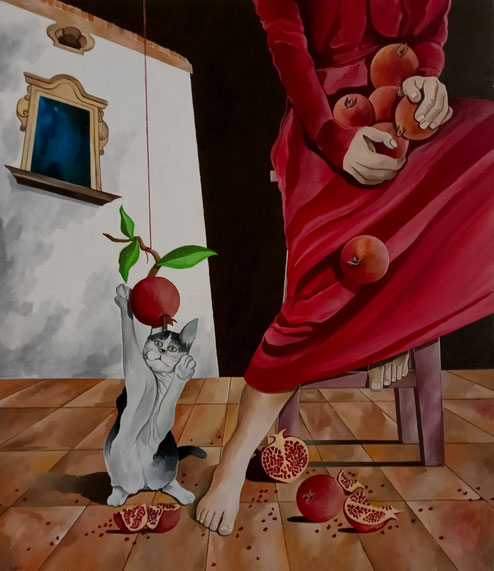 Il gatto, il colore rosso porpora del suo abito, e i melograni, spunti simbolici della sua personalità.